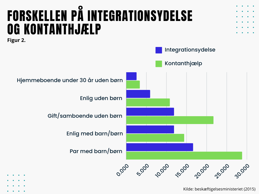 I 2015 blev integrationsydelsen indført for flygtninge og familiesammenførte nyankomne udlændinge, som ikke kunne forsørge sig selv. Integrationsydelsen var en social offentlig ydelse, der var meget lavere end kontanthjælpen. Målet var at gøre asyl mindre attraktivt og øge incitamentet til at arbejde, og dermed blive integreret i landet (se figur 2).