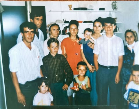 Familien Fejzic i 1994 i flygtningelejren Zelani Jadar. Til venstre står Elvir Fejzic’ onkel og bag ham står Elvir Fejzic’ far. De blev begge henrettet af serbiske soldater. Til højre side står Elvir Fejzic og bag ham står hans farmor. Foto: ukendt FN-soldat